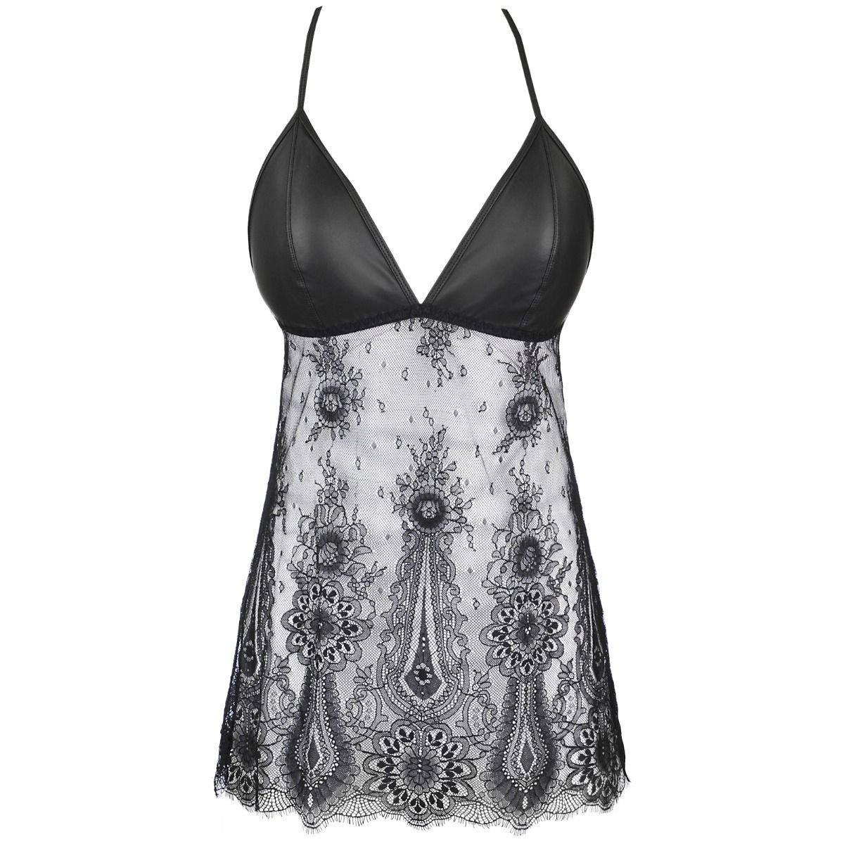 Axami prezentuje Bodydoll V-9789 - bardzo zmysłową i lekką koszulkę typu babydoll w komplecie z lateksowymi stringami. Delikatny, przezroczysty wzór bogato zdobionej czarnej koronki otula Twoje ciało, a góra wykończona lśniącym lateksem to niesamowicie pobudzający element.