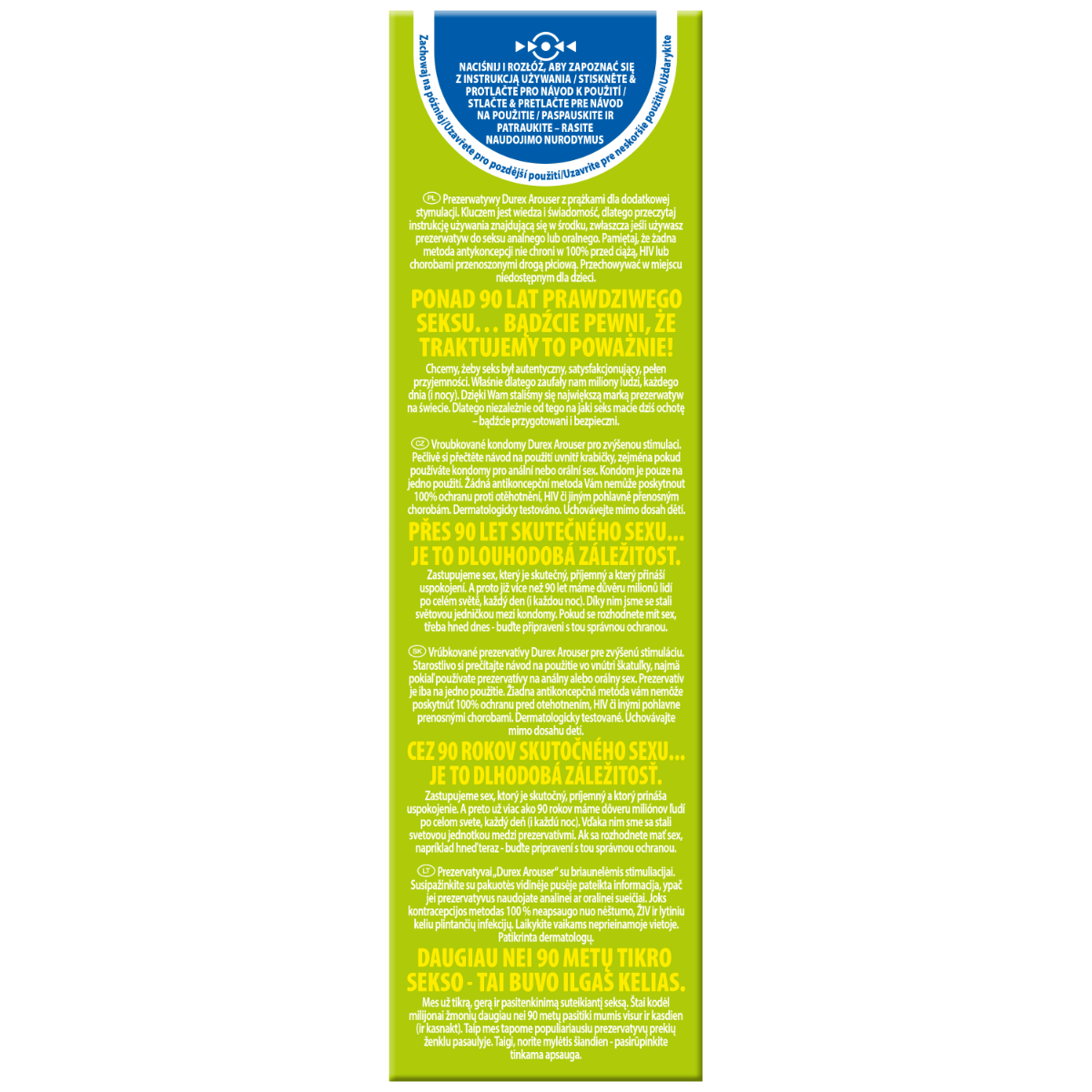 Prezerwatywy lateksowe Durex Arouser zostały stworzone by zapewnić Wam dodatkowe doznania. Te lateksowe prezerwatywy sprawią, że będziecie czerpać jeszcze więcej przyjemności z seksu. Produkt wyróżni się poprzecznymi prążkami, które wzmacniają wrażenia. Prosty kształt zapewnia z kolei znakomite przyleganie. Dodatkowo, dla Waszego komfortu, pokryto je środkiem nawilżającym. Durex Arouser posiadają przyjemny zapach. Wystąpienie wysypki, swędzenia, pieczenia czy też podrażnienia w trakcie używania to znak, że należy przerwać stosowanie produktu. W przypadku, gdy objawy nie ustępują niezbędne jest zasięgnięcie porady lekarskiej. Prezerwatywy należy przechowywać w suchym miejscu, z dala od działania promieni słonecznych. Produkt został przetestowany dermatologicznie i elektronicznie, by zapewnić Wam gwarancję bezpieczeństwa. Nie używaj lubrykantów tłuszczowych, kiedy używasz prezerwatyw. W pudełku znajdują się 12 sztuk prezerwatyw.