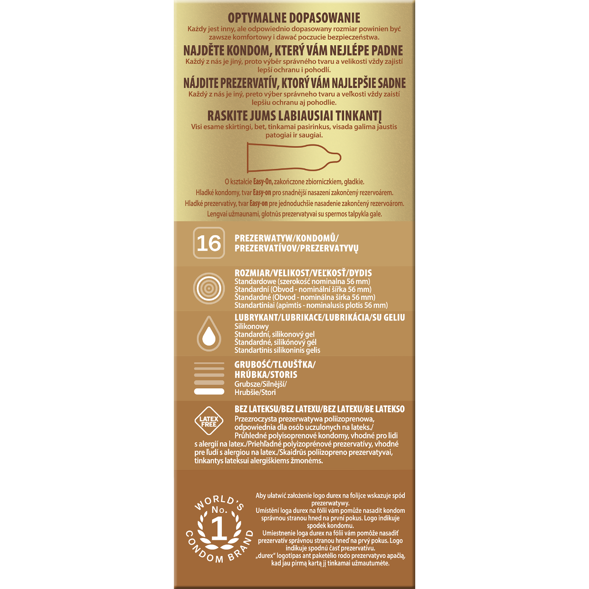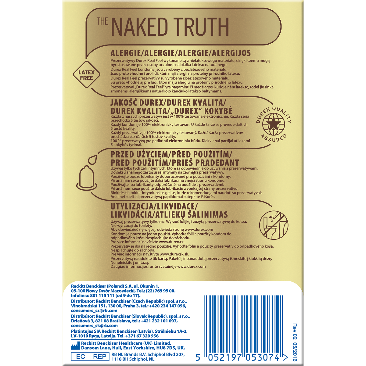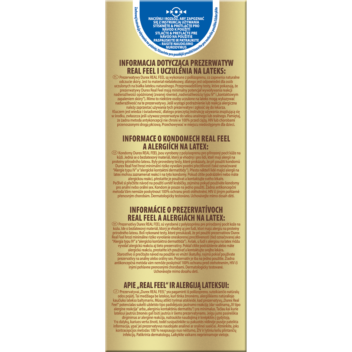Prezerwatywy nielateksowe Durex Real Feel są niezwykle cienkie i pokryto je dodatkową substancją nawilżającą. Taki model na pewno podziała na zmysły i sprawi, że Wasza przyjemność będzie trwała jeszcze dłużej. Prezerwatywy nielateksowe są idealne dla alergików, uczulonych na lateks. Od tej pory możecie cieszyć się sobą bez obaw o reakcje uczuleniowe. Specjalna technologii wytwarzania gwarantuje przyjemny zapach. Od tej pory nic nie przeszkadza w relaksie i intymnych chwilach. Durex Real Feel prezerwatywy nielateksowe mogą w niektórych przypadkach powodować opóźnioną nadwrażliwość. Część osób uczulonych na lateks może być również nadwrażliwa na ten model. W razie wystąpienia reakcji alergicznych należy przerwać stosowanie prezerwatyw i skontaktować się z lekarzem. Produkt został przetestowany dermatologicznie i elektronicznie, więc gwarantuje poczucie 100% bezpieczeństwa. W pudełku znajduje się 16 sztuk prezerwatyw. Durex Real Feel należy przechowywać w suchym miejscu, z dala od działania promieni słonecznych.