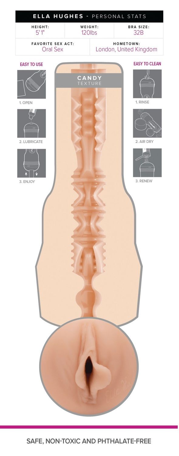 Rękaw Fleshlight Girls Candy Ella Hughes idealnie nada się dla mężczyzn, którzy pragną przeżyć intensywne chwile rozkoszy, które zaczynają się od falującej struktury, a następnie przenoszą się w mistyczną jaskinię z wyrazistymi krawędziami i giętkimi wypustkami. Candy Ella Hughes to podróż ku szczytom przyjemności.
