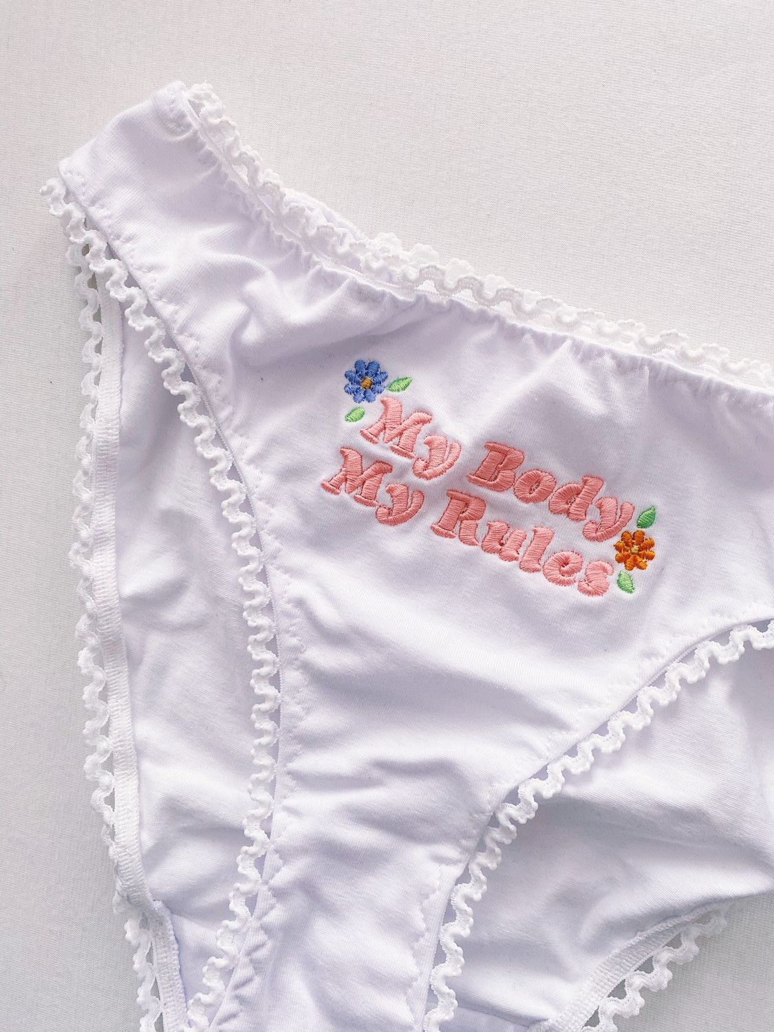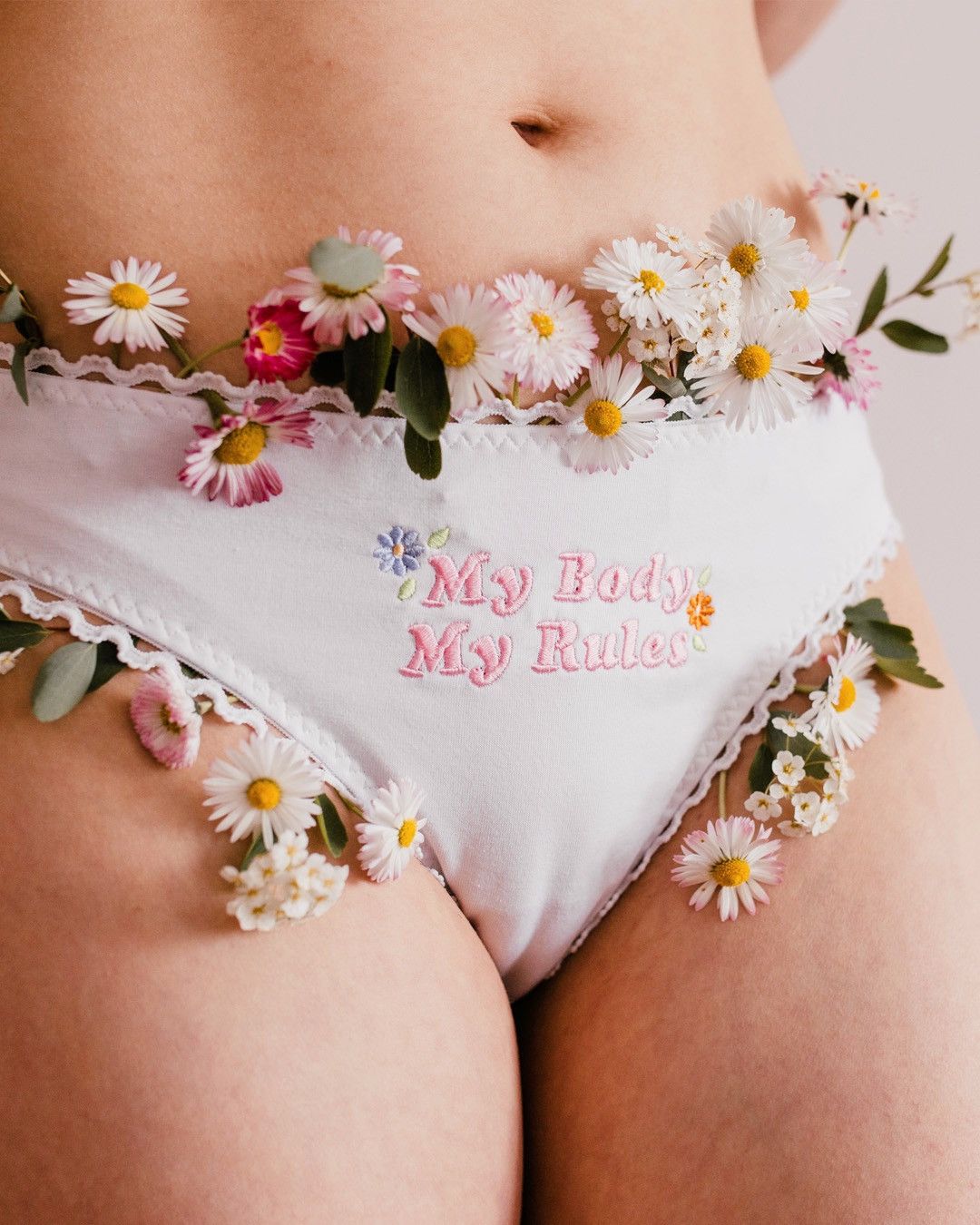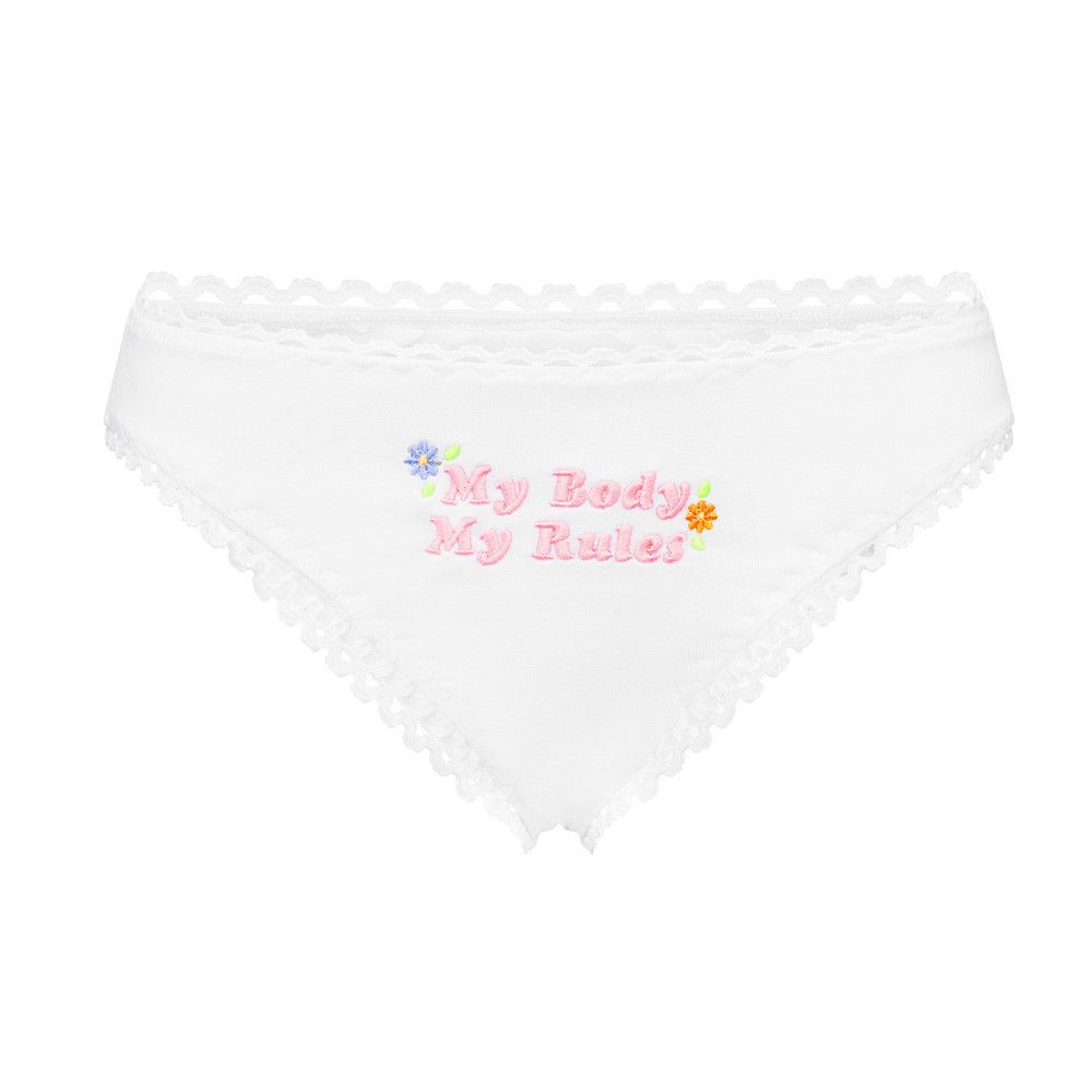 Piękno tkwi w prostocie. Klasyczne, białe figi obszyte delikatną lamówką zachwycają swoją delikatnością. Piękny haft My Body My Rules z kwiatami dodaje charakteru całej kompozycji. Wykonane z wysokiej jakości, miłej w dotyku bawełny z dodatkiem elastanu.