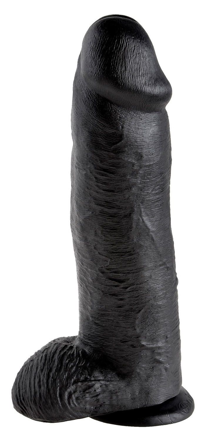 King Cock 12” Cock With Balls Black to dildo z jądrami oraz przyssawką. Gadżet wyróżnia się tym, że idealnie odwzorowuje penis. Specjalnie wyprofilowany, anatomiczny kształt, główka, żyłkowania i jądra sprawiają, że podziała on na wyobraźnię i zapewni Ci wyjątkowe bodźce. Dzięki przyssawce, możesz z niego korzystać bez użycia rąk. Solidnie trzyma się ona każdej płaskiej powierzchni. Zabawa takim dildem gwarantuje przyjemność podobnej do tej, płynącej z prawdziwego seksu. King Cock został wykonany z bezpiecznego i hipoalergicznego winylu (bez dodatku ftalanów i lateksu). Gadżet wyprodukowano w USA.