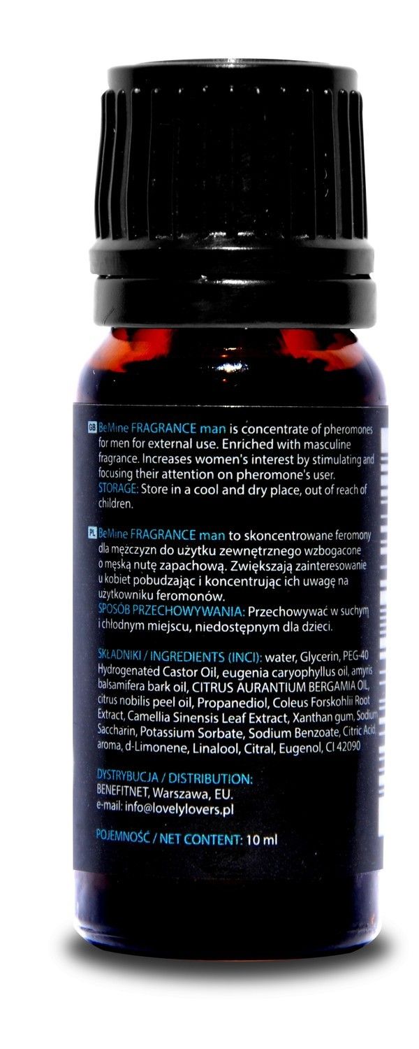 Lovely Lovers BeMine Fragrance for man to feromony o potwierdzonym działaniu, które zostały wzbogacone odpowiednią nutą zapachową. Połączenie bergamotki, cytryny, rozmarynu, lawendy na pewno podziałają oszałamiająco na płeć przeciwną. Jeśli do tego dodamy drzewo sandałowe, wanilię i drzewo cedrowe, to całość będzie niesamowicie trwała. Wykorzystaj odpowiednio działanie tych nut zapachowych, a żadna kobieta się Tobie nie oprze. Staniesz się automatycznie bardziej atrakcyjny w oczach kobiet. Poza tym kompozycja pomoże Ci także w relacjach międzyludzkich. Zwiększenie pewności siebie i poczucia dominacji sprawią, że obudzi się w Tobie samiec alfa. Lovely Lovers BeMine Fragrance for man to feromony, które działają już od pierwszego zastosowania! Produkt jest całkowicie bezpieczny.