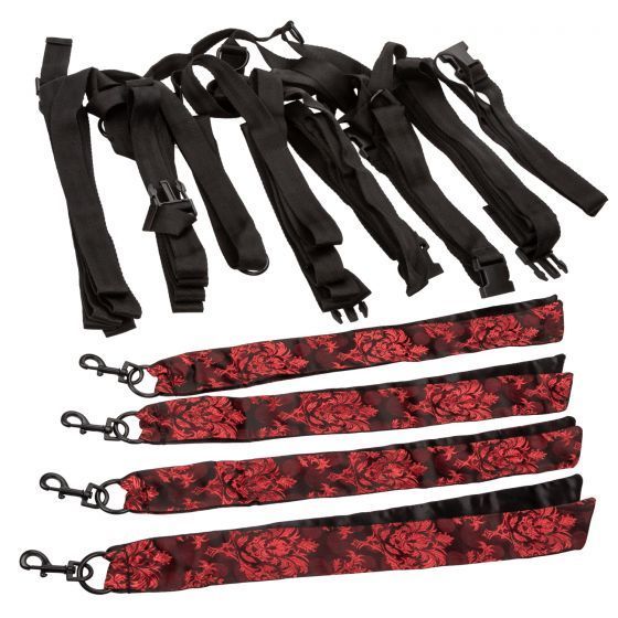 Pasy do wiązania pod materac Scandal 8 points od love to rozbudowany zestaw, dający masę możliwości. Składa się on z pasów, umieszczanych pod łóżkiem oraz z uprzęży. Uprząż służy przywiązywaniu pasów. Z takim gadżetem możesz w dowolnej pozycji unieruchomić drugą osobę i zapewnić Wam niezapomniane przeżycia. Pasy wykonano z miękkiego materiału, który nie powoduje otarć. Metalowe kółeczka umożliwiają podpięcie dodatkowych gadżetów i wzmocnienie wrażeń. Metal nie zawiera w składzie niklu, więc jest całkowicie bezpieczny. Długość pasów wynosi 508 cm na 457 cm, zaś długość uprzęży 61 cm.