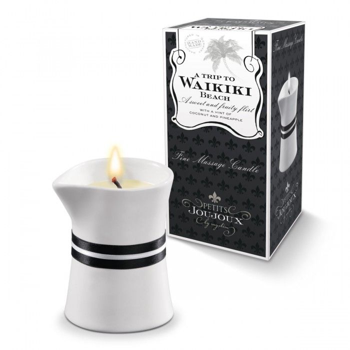 Petits Joujoux fine massage candle Trip to Waikiki – luksusowa, ręcznie robiona świeca do masażu stanowiąca ciekawszą alternatywę dla tradycyjnych olejków. Podpalając świecę stopniowo budujesz nastrój. Subtelne światło płomienia lekko rozświetla sypialnię. Bardzo słodki, pobudzający zapach kokosa i ananasa powoli rozchodzi się po pomieszczeniu lekko odurzając zmysły. Po około 5 minutach od podpalenia stała konsystencja świeczki zmieni się w ciepły, lecz nie gorący, gęsty olejek do masażu. Wylej go bezpośrednio na ciało lub na swoje dłonie i wykonaj masaż. Po skończeniu masażu zdmuchnij świeczkę. Olejek powróci do pierwotnej konsystencji aż do kolejnego podpalenia.