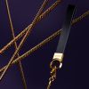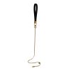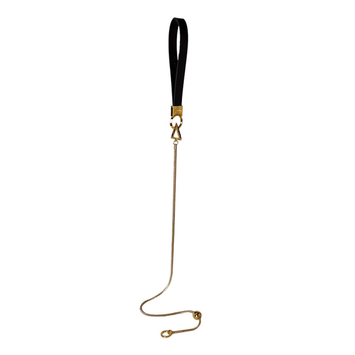 Gustownie wykonana błyszcząca pozłacana metalowa smycz łańcuszkowa ze skórzanym uchwytem. Prosta, klasyczna, a zarazem elegancka.